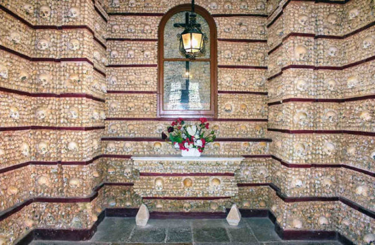 Sit inside the chapel, and you’ll see bones climbing the walls all around you, with skulls featuring prominently in some sections.