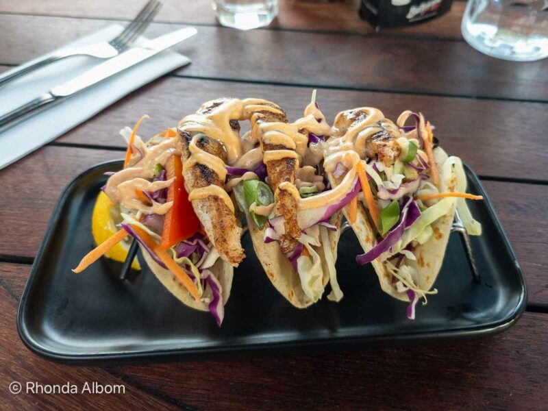 Then we found the popular Bully Hayes restaurant, best known for local seafood and chowder. I had fresh Akaroa salmon cooked to perfection. It was possibly the best salmon I have tried. Importantly, this place is known for being safe for coeliacs, and I felt confident that my meal was made gluten-free and safe for me to eat. Jeff had the fish tacos and loved them, too. We ate outside, overlooking the harbour, which to me was perfect. Surprisingly, the majority of those who booked chose an inside table.